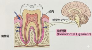 その最大の理由は、「歯根膜(しこんまく)」という組織の存在です。 歯の根の周りにあるこの薄い膜は、噛んだ時の硬さや感触を脳に伝えるセンサーの役割を果たしています。「髪の毛一本噛んでも分かる」と言われる繊細な感覚は、この歯根膜のおかげです。また、噛む力を分散させるクッションの役割も持っています。